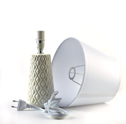 Lampa z serii LETI BEIGE marki MONDEX składa się ceramicznej podstawy i klosza z materiału. Tłoczona podstawa w kolorze beżowym sprawia, że nada ona niezwykłego klimatu wnętrzu. Tłoczenie dodaje niezwykły efekt wielowymiarowości lampy. Wpołączeniu z białym kloszem idealnie wpasowuje się w obecne trendy. Wymiary: 9,5x6,5xh32,5cm z kloszem Podstawa:9,5x6,5xh24,5cm z gwintem Klosz: 14x19,5xh15cm Żarówka, gwint: E14 max 60W Długość kabla: 120cm waga:682g/720g opakowaniem Podstawa lampy zapakowana w brown box: 10x9,5xh24,5cm, klosz osobno Lampa stołowa ceramiczna to jeden z najpopularniejszych rodzajów lamp, wykorzystywanych w wielu domach i biurach na całym świecie. Swoją popularność zawdzięcza zarówno praktyczności, jak i estetyce. W dzisiejszych czasach dostępnych jest wiele różnych modeli i wzorów, dzięki czemu każdy może znaleźć coś odpowiedniego do swojego wnętrza. Lampy stołowe ceramiczne mają długą historię, sięgającą aż do starożytnych Chin. W tamtych czasach wykorzystywano je głównie jako źródło światła w świątyniach i pałacach cesarskich. Jednak dopiero w XIX wieku, dzięki rozwojowi przemysłu ceramicznego, stały się popularne w Europie. Wówczas zaczęto wykorzystywać je również do oświetlenia domów i biur.