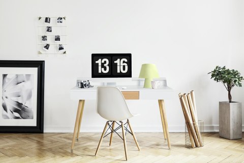 Biurko Skans to miejsce do pracy nie tylko w biurze, ale również w domowym zaciszu. Biurko z białym blatem i drewnianymi nogami oprócz swojej roli roboczego blatu będzie również ozdobą domowego biura. Podstawą biurka są cztery bukowe, polakierowane nogi, które delikatnie rozchodzą się na boki, nawiązując do stylu vintage. Biały szeroki blat zrobiony został z laminowanej płyty MDF, dzięki czemu jest niezwykle wytrzymały. Biurko posiada niskie ścianki o wysokości 9,5cm, które tworzą swoiste miejsce do segregowania biurowych akcesoriów. Ścianki pomagają utrzymać porządek na biurku. Ciekawym kontrastowym elementem biurka jest szuflada z frontem o wysokości 11 cm w okleinie imitującej naturalne drewno. Szuflada dzięki zastosowaniu wysokiej jakości szyn otwiera się bardzo delikatnie. Wysokość ścianki: 9,5 cm Gł. przegródek: 7 cm. Gł. wewnątrz szuflady: 23,5 cm Szer. wewnątrz szuflady: 35 cm Szer. przegródki środkowa: 45 cm, zewnętrzne: 31,5 cm Rozstaw nóg: 120 cm