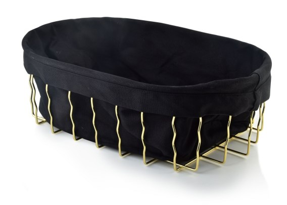 Owalny metalowy złoty Koszyk z serii CASSIE marki COOKINI. Wyścielany czarnym materiałem. Idealny na stół kuchenny do podawania pieczywa lub do przechowywania różnych drobiazgów.