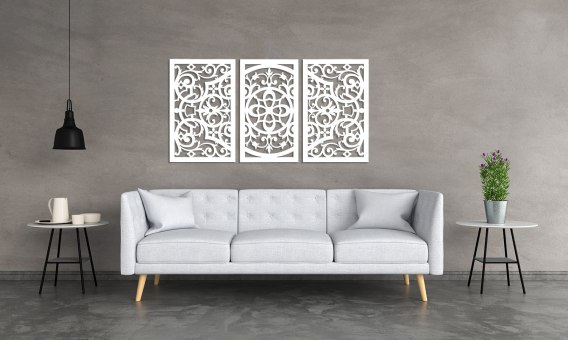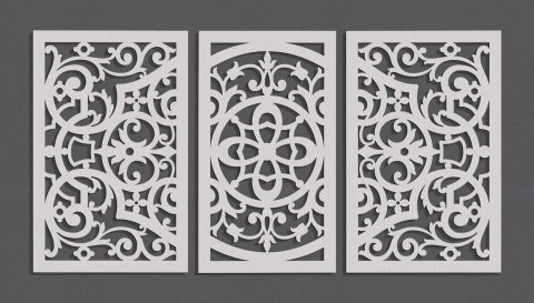 Ażurowa dekoracja ścienna 3D ( tryptyk ) inspirowana klasyczną , kwiatową ornamentyką w stylu włoskiego renesansu.