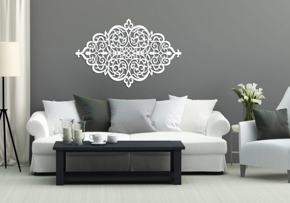 Dekoracyjny panel ażurowy inspirowany marokańskimi arabeskami z roślinnymi wzorami. Oryginalna dekoracja ścienna 3D ozdobi Twoją ścianę w salonie czy w sypialni, idealna nad sofę, łóżko czy komodę. Stylowa dekoracja będąca unikalnym elementem Twojej aranżacji. Dekoracja wykonana z wysokiej jakości drewna ( naturalna sklejka brzozowa o grubości 4 mm ). Ręcznie wykończona i pomalowana ekologiczną,wodną farbą. Wymiar dekoracji 80 x 120 cm. Zalecany sposób montażu: małe elementy - taśma piankowa dwustronna lub haczyki montażowe TESA, większe elementy - klej montażowy do listew i sztukaterii ( np klej uniwersalny " ośmiorniczka ", mała tubka 50 g.).