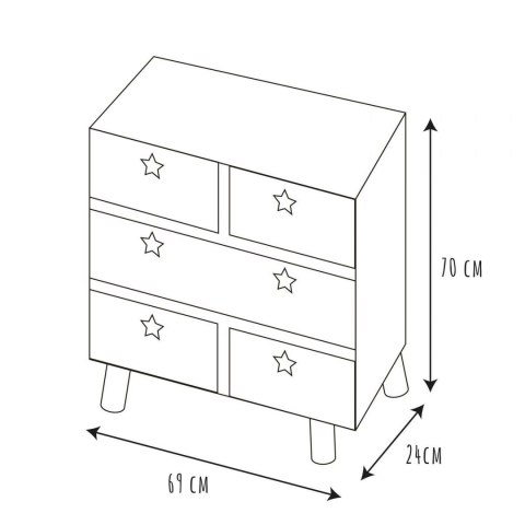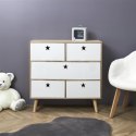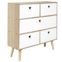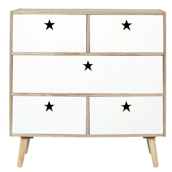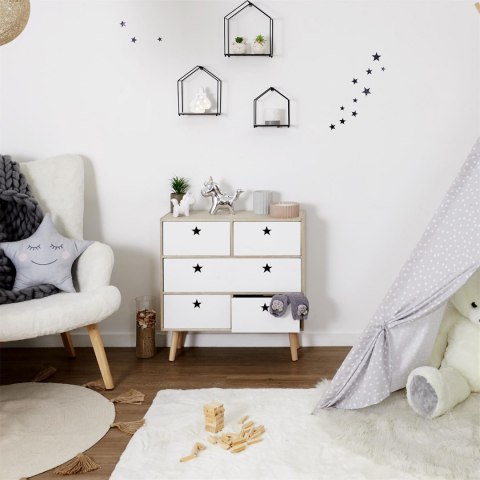 Komoda do pokoju dziecięcego Etoile to pakowny mebel, który utrzyma w porządku ubrania, buty lub zabawki. Komoda wykonana z białych frontów i korpusu w kolorze drewna umieszczona została na czterech sosnowych nogach, które delikatnie rozchodzą się na boki. Komoda wyposażona została w pięć szuflad. Na każdym froncie szuflady, zamiast standardowego uchwytu wycięty został uchwyt w kształcie gwiazdki. Korpus i fronty mebla wykonane zostały z płyty MDF. Wymaga montażu: tak Wymiary opakowania: 61x73x12cm Waga: 16,5 kg