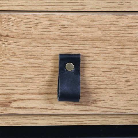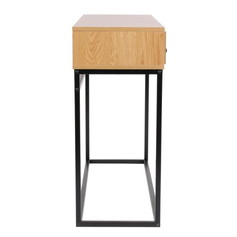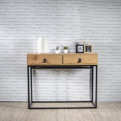 Konsola zaprojektowana została z myślą o uniwersalnym wpisaniu się w różne potrzeby. Pięknie wygląda w domowym salonie, ale świetnie uzupełni również wnętrze w przestrzeni biurowej. Prostota jej formy stanowi kluczowy motyw w łatwej aranżacji z jej zastosowaniem. Konsola Abbott powstała ze sprawdzonych materiałów najwyższej jakości. Blat wykonano z trwałej i solidnej płyty laminowanej w kolorze złotego dębu. Nogi natomiast zaprojektowane zostały z bardzo wytrzymałego metalu, pomalowanego proszkowo na czarno. Blat oraz szuflady dają mnóstwo przestrzeni, którą można dowolnie zagospodarować. Ciekawe ułożenie nóg daje nie tylko stabilną podporę mebla, ale również sprawia, że całość wygląda niebanalnie. Waga konsoli: 17 kg Max ilość szt. w kartonie: 1 Wymiary kartonu: 101cm x 36cm x 12cm