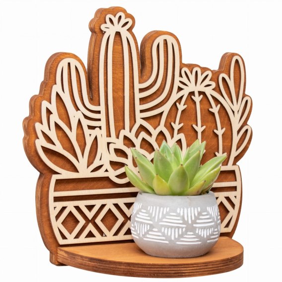 Półeczka składa się z dwóch warstw - pierwsza z solidnej 15 mm sklejki brzozowej, druga zaś z delikatnego, ażurowego, koronkowego wzoru o grubości 4 mm, który dodaje całej dekoracji lekkości. Motyw kaktusów w stylu boho uniwersalny i bardzo dekoracyjny