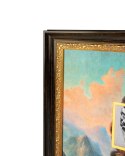 Tło obrazu to subtelnie zarysowany pejzaż z górskimi szczytami, które dodają głębi kompozycji.