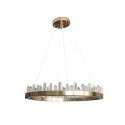 Żyrandol wisi na 3 stalowych linkach mocowanych do złotej podsufitki, a wewnątrz okręgu ledowe światło rozpraszają 64 kryształy ułożone wedle naszego upodobania.