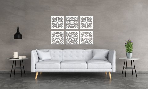 Zestaw 6 ażurowych dekorów inspirowanych kwiatową ornamentyką. Dekoracja wykonana z wysokiej jakości drewna ( naturalna sklejka brzozowa o grubości 4 mm ). Ręcznie wykończona i pomalowana ekologiczną,wodną farbą. Wymiar całości 80 x 120 cm, wymiar pojedynczego dekoru 40 x 40 cm.