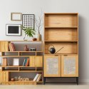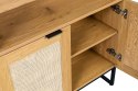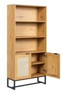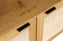 Regał z półkami w stylu boho z rattanowymi frontami to idealny mebel do sypialni lub salonu w naturalnych, jasnych kolorach. Regał z trzema półkami i szafką z dwoma frontami pozwoli na przechowywanie nie tylko ubrania, ale również talerzy, sztućców, obrusów i innych przedmiotów. Regał stoi stabilnie dzięki metalowej podstawie. Nogi szafki Capri zostały polakierowane proszkowo na czarno. Dębowa okleina, którą została wykończona szafka, niezwykle dokładnie imituje naturalny kolor oraz teksturę drewna. Swoją wytrzymałość Regał Capri zawdzięcza trwałym materiałom jak płyta MDF, z której wykonany został korpus i półki oraz metal użyty na podstawie. Fronty szafki w środku wykonane zostały z naturalnego rattanu. Naturalny rattan to nie tylko niewiarygodnie dobrze wyglądający materiał. Rattan przede wszystkim gwarantuje cyrkulację powietrza w komodzie. Wymiary opakowana: 112x39.5x18.5cm 61x47.5x16cm
