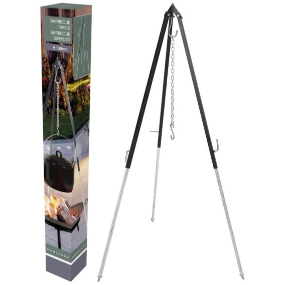 <p>Trójnóg przeznaczony do zawieszenia kociołków i rusztów grillowych o różnych rozmiarach. Niezwykle wytrzymały i stabilny. Posiada regulowaną wysokość. Dzięki niemu można wygodnie i bezpiecznie przygotowywać różnorodne potrawy na świeżym powietrzu, zarówno nad otwartym ogniem, jak i na grillu lub nad paleniskiem. Sprawdzi się zarówno w ogrodzie, jak i podczas obozów, kempingów czy biwaków. <strong>Oryginalny produkt holenderskiej marki Ambiance.</strong> Wyprodukowano zgodnie z europejskimi standardami.</p>