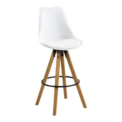 Praktyczny i komfortowy stołek barowy Dima. Wygodny stołek w stonowanej kolorystyce i nowoczesnym stylu ma obiteczarną eko skórą siedzisko i drewnianą podstawę. Siedzisko jest wymodelowane wraz z oparciem jako jeden element, z dodatkową poduszką również obitą eko skórą w czarnym kolorze. Podstawa w formie czwórnogu wykonana jest z listew z drewna kauczukowego, pobejcowanego na kolor dębu i zabezpieczonego olejem. Na dole nogi stołka objęte są czarnym metalowym relingiem pełniącym funkcję podpórki pod stopy. Całość będzie doskonale wyglądać w pubie lub jako siedzisko przy wyspie w kuchni. Waga: 7,75 kg. Wymiary kartonu: 74cm x 37cm x 56cm Wysokość siedziska: 75 cm Szerokość siedziska: 48,5 cm Głębokość siedziska: 40 cm