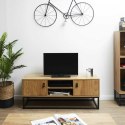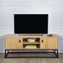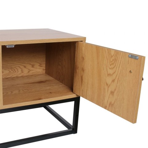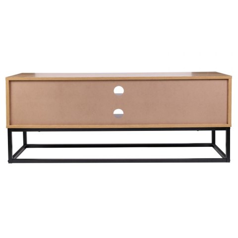 Szafka RTV to mebel niezbędny w każdym salonie. Choć bardzo zgrabna - wyjątkowo pojemna. Niewielkie gabaryty pozwalają pomieścić wszystko, co w takiej szafce powinno być pod ręką. Szafka posiada dwie szafki zamykane z uchwytem z eko skóry i dwie otwarte, przestronne półki. Do tego gładki blat, który stanowi dodatkową przestrzeń użytkową. Zamiast tradycyjnych nóg, wykorzystaliśmy metalowy czarny malowany proszkowo stelaż, na którym mebel solidnie wspiera swój ciężar. Szafka RTV powstała z bardzo mocnej i odpornej na intensywne użytkowanie płyty laminowanej. Elegancki kolor w odcieniu złotego dębu, z dekorami imitującymi do złudzenia naturalne wybarwienie i słoje drewna, uzupełnia stalowa konstrukcja w kolorze czarnym. Waga szafki: 21 kg Max ilość szt. w kartonie: 1 Wymiary kartonu: 120cm x 40cm x 10cm
