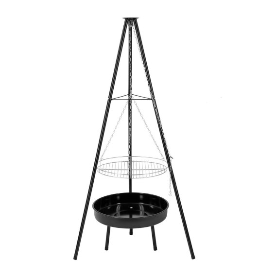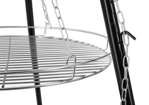 Statyw jest malowany proszkowo, co zapewnia większą odporność na uszkodzenia mechaniczne i warunki atmosferyczne. Wysokość kotła lub rusztu grilla można łatwo regulować za pomocą łańcucha na kole pasowym znajdującym się u góry statywu oraz haków.