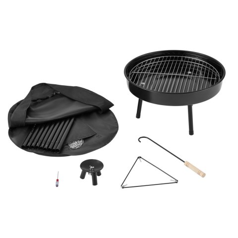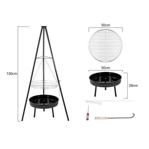 ⭐ W skład zestawu wchodzą: stalowy trójnóg, palenisko, ruszt z łańcuchem, opakowanie transportowe, stalowy hak do przenoszenia rusztu