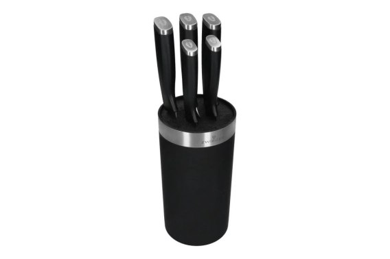 Zestaw noży w bloku z kolekcji Forte III marki Zwieger to praktyczne i stylowe rozwiązanie dla każdej kuchni. W jego skład wchodzi pięć podstawowych noży: nóż szefa, nóż do chleba, nóż do plastrowania, nóż uniwersalny oraz nóż do warzyw i owoców. Ostrza wykonane są z wysokiej jakości stali nierdzewnej o twardości 48 HRC, co zapewnia trwałość i precyzję krojenia.Ergonomiczne rękojeści z tworzywa PP z metalowym zakończeniem gwarantują wygodę użytkowania i doskonałe wyważenie noży. Czarny blok wykonany z trwałego tworzywa z metalową obręczą jest nie tylko funkcjonalny, ale również estetycznie wkomponuje się w wystrój każdej kuchni. Blok chroni ostrza przed uszkodzeniem, a także pozwala na ich bezpieczne przechowywanie.Materiały zastosowane do produkcji zarówno noży, jak i bloku, są trwałe i łatwe w czyszczeniu, co sprawia, że zestaw jest praktyczny w codziennym użytkowaniu. Zestaw Forte III sprawdzi się zarówno w domowej kuchni, jak i w rękach bardziej wymagających użytkowników. To połączenie funkcjonalności, trwałości i eleganckiego designu.Każdy z noży w zestawie jest starannie zaprojektowany, aby spełniać różnorodne potrzeby w kuchni, od krojenia pieczywa po precyzyjne siekanie warzyw. Zestaw Forte III to niezawodny wybór, który ułatwia przygotowywanie posiłków i dodaje kuchni profesjonalnego charakteru. Dzięki temu zestawowi codzienne gotowanie stanie się przyjemniejsze i bardziej efektywne.