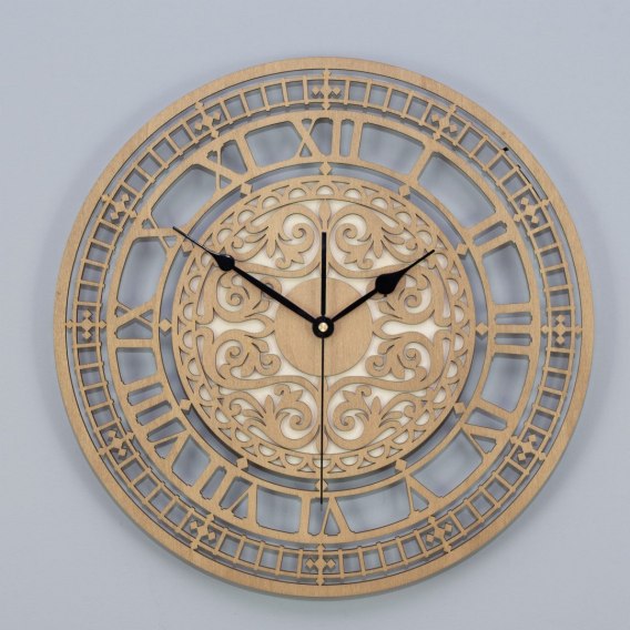 Grubość calkowita dekoracji 2,3 cm (warstwa sklejki 8 mm + mechanizm zegara 15 mm)