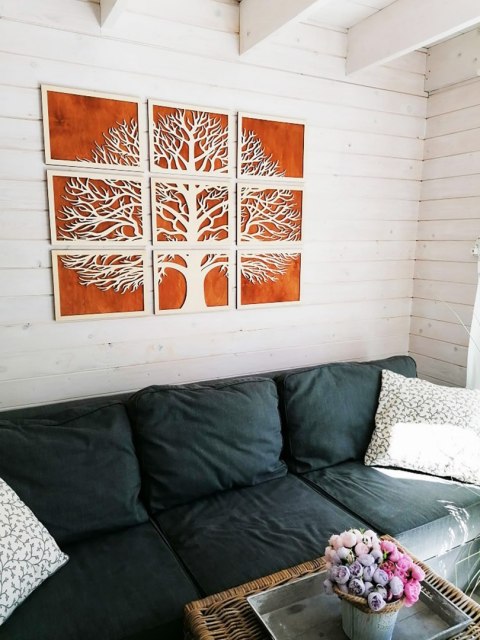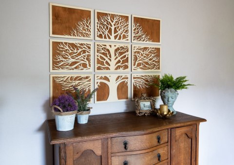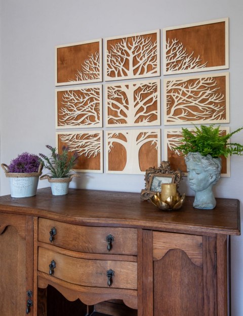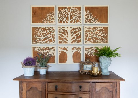 Zestaw ażurowych dekorów ściennych tworzących mozaikę inspirowany klasycznym ornamentem z motywem drzewa życia. Wyjątkowa dekoracja będąca unikalnym elementem aranżacji.