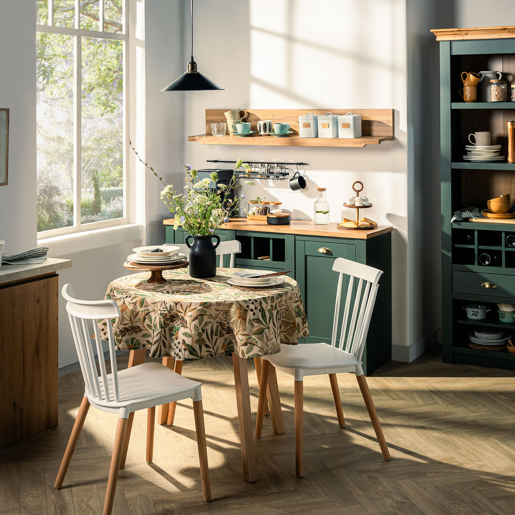 Zestawione z okrągłym stołem nakrytym wzorzystym obrusem tworzą przytulny kącik jadalniany, który aż prosi się o długie, rodzinne śniadania. Naturalne światło wpadające przez duże okno, świeże kwiaty w wazonie i zielone akcenty w postaci roślin doniczkowych dopełniają obrazu idealnej, skandynawskiej jadalni. Z tymi elementami stworzysz przestrzeń, która zachęca do celebrowania codziennych chwil i delektowania się prostymi przyjemnościami – esencją stylu hygge.